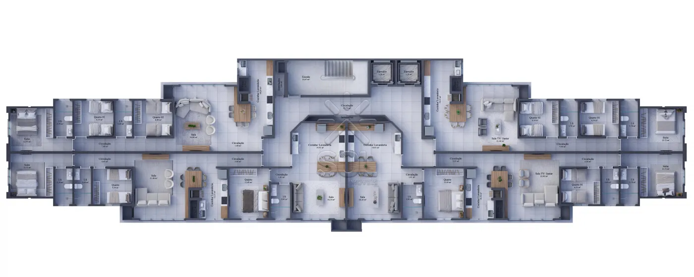 - Apartamentos de 1 quarto: 55,36 m² - perfeitos para quem busca um estilo de vida mais compacto, sem abrir mão do conforto.