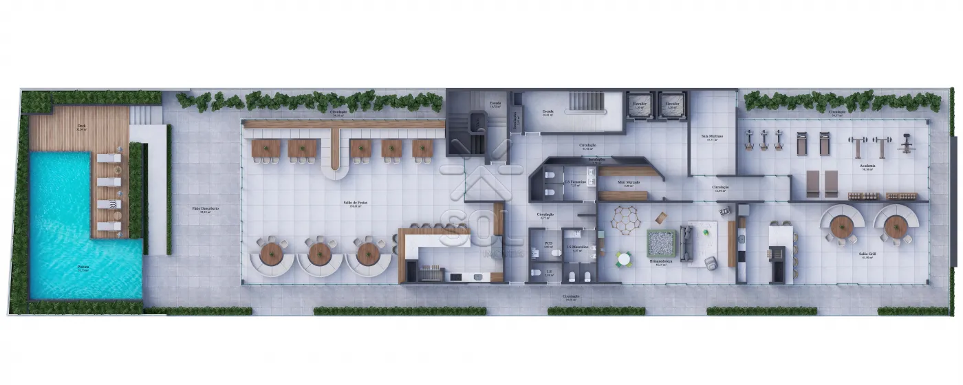- Lazer: Piscina, salões de festas, sala de jogos e brinquedoteca.