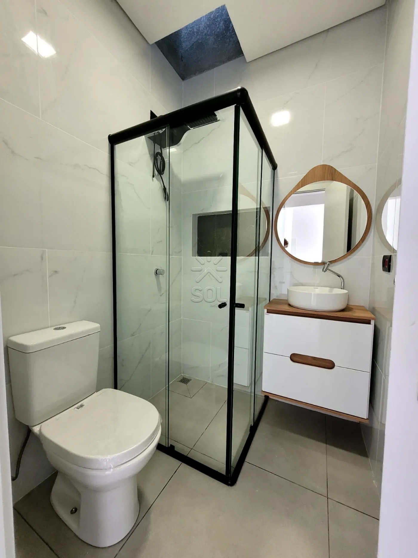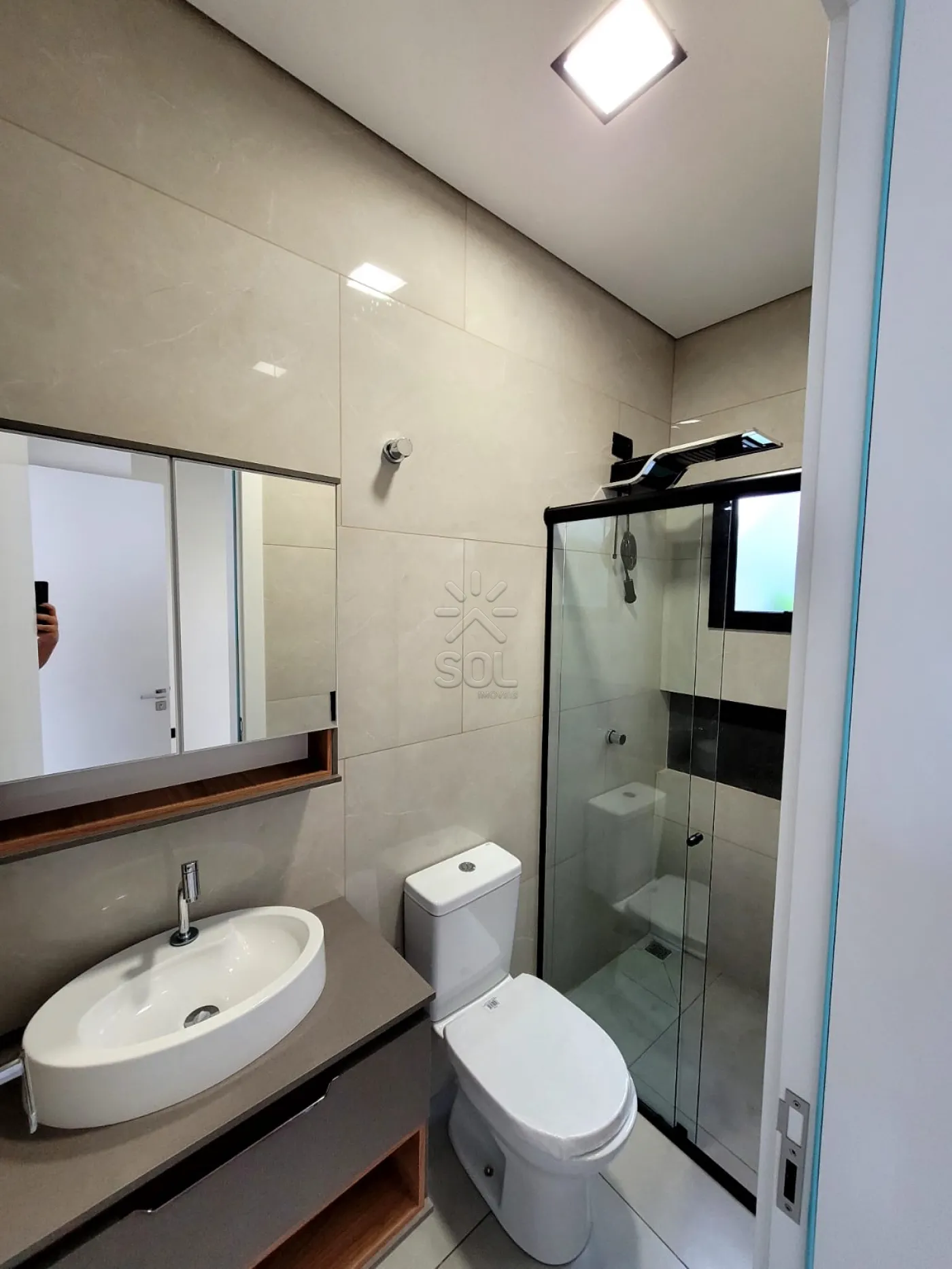 - Banheiro social com armário, box e chuveiro;