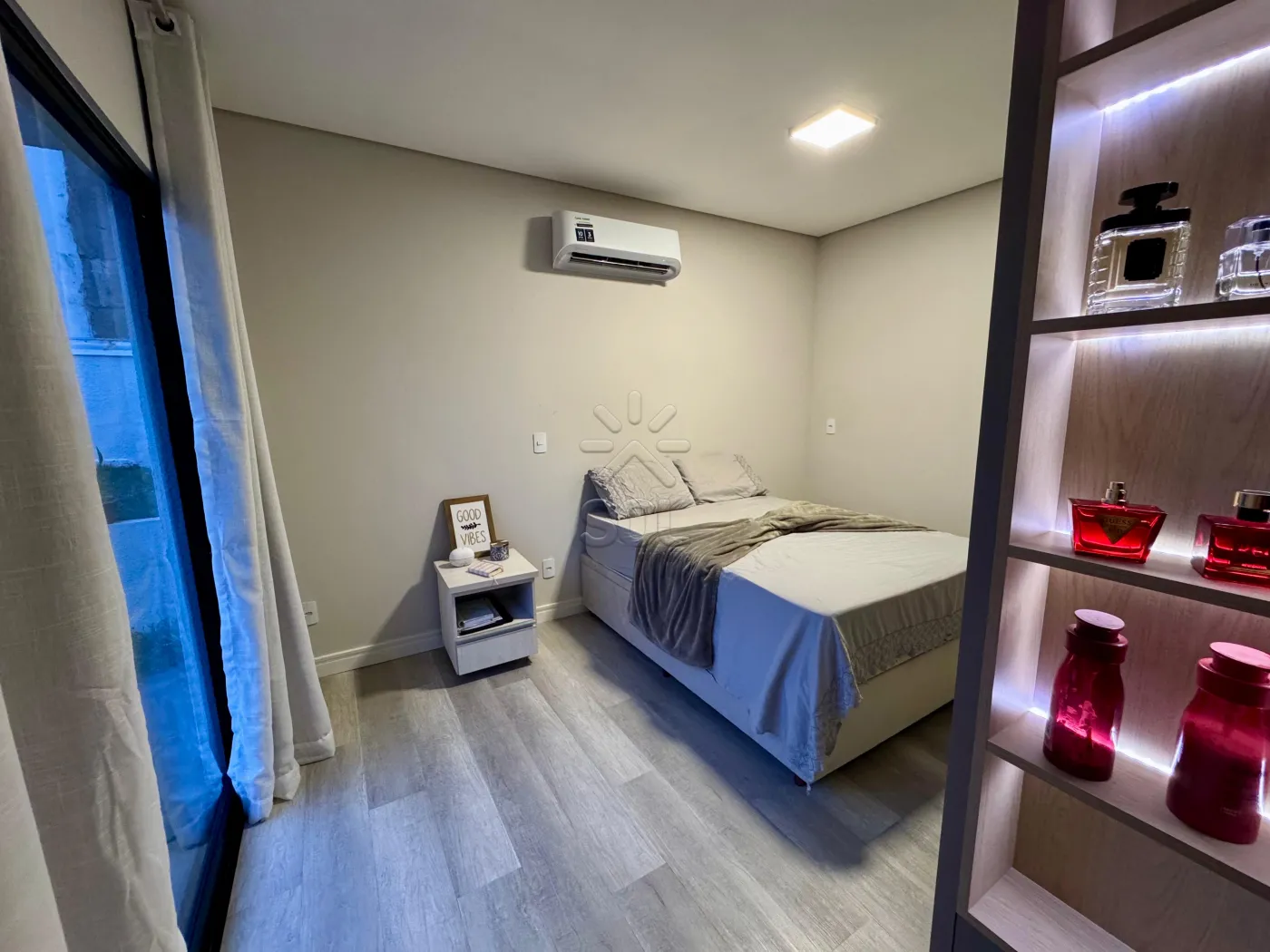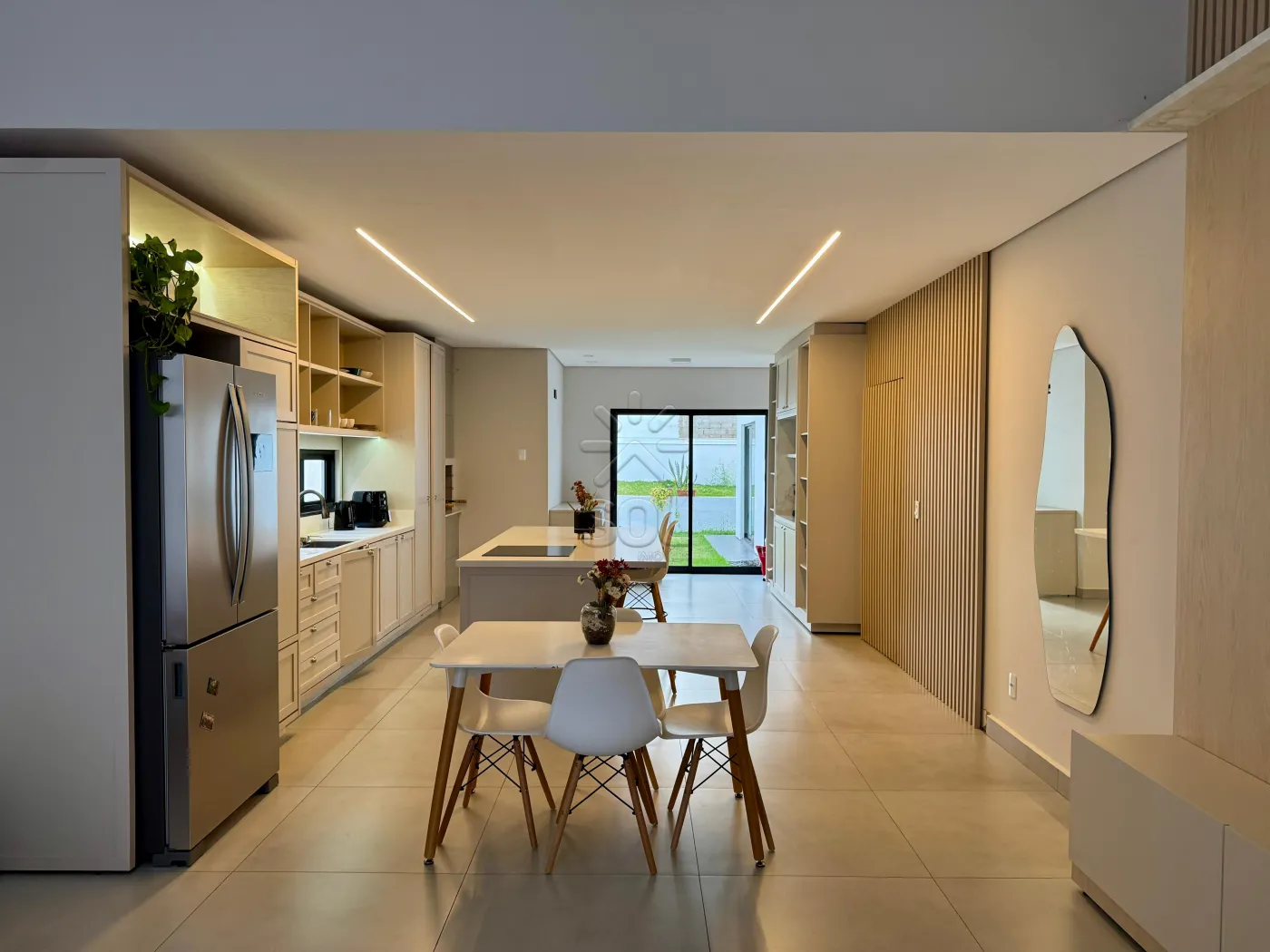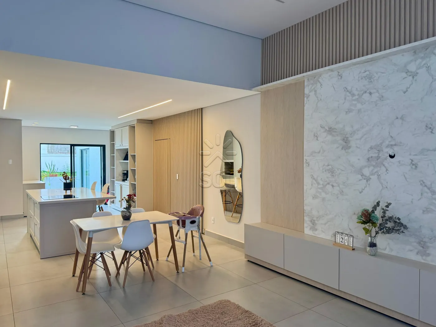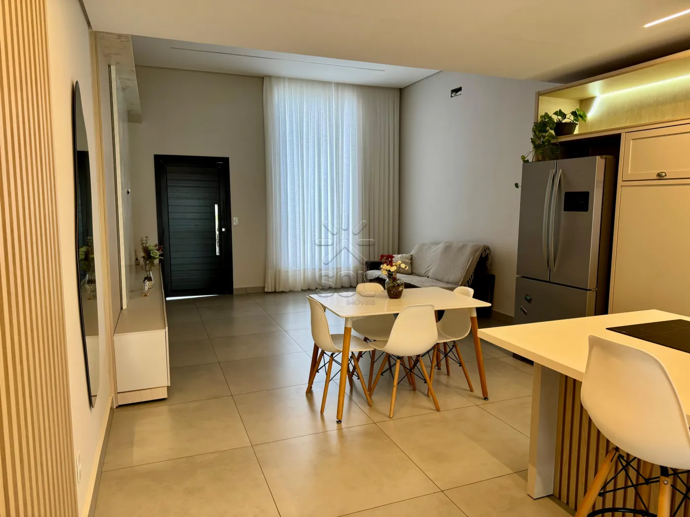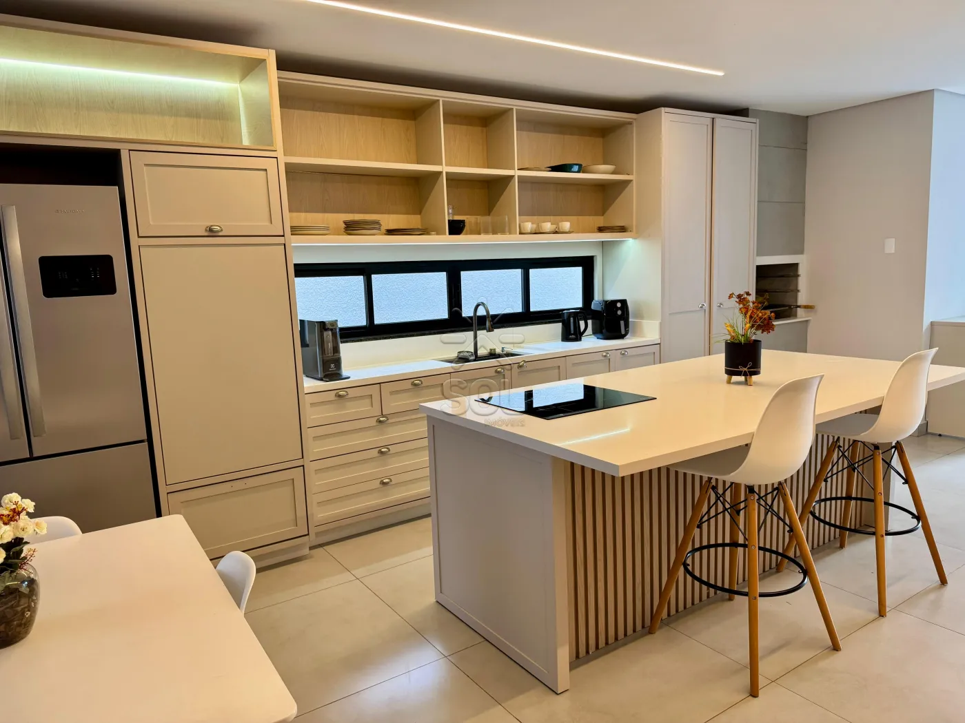 - Sala de estar e jantar integradas a cozinha gourmet com churrasqueira;