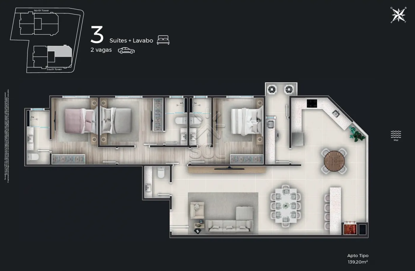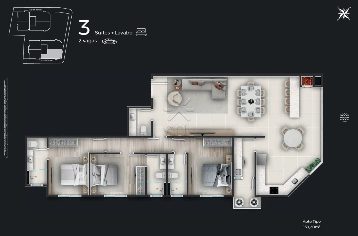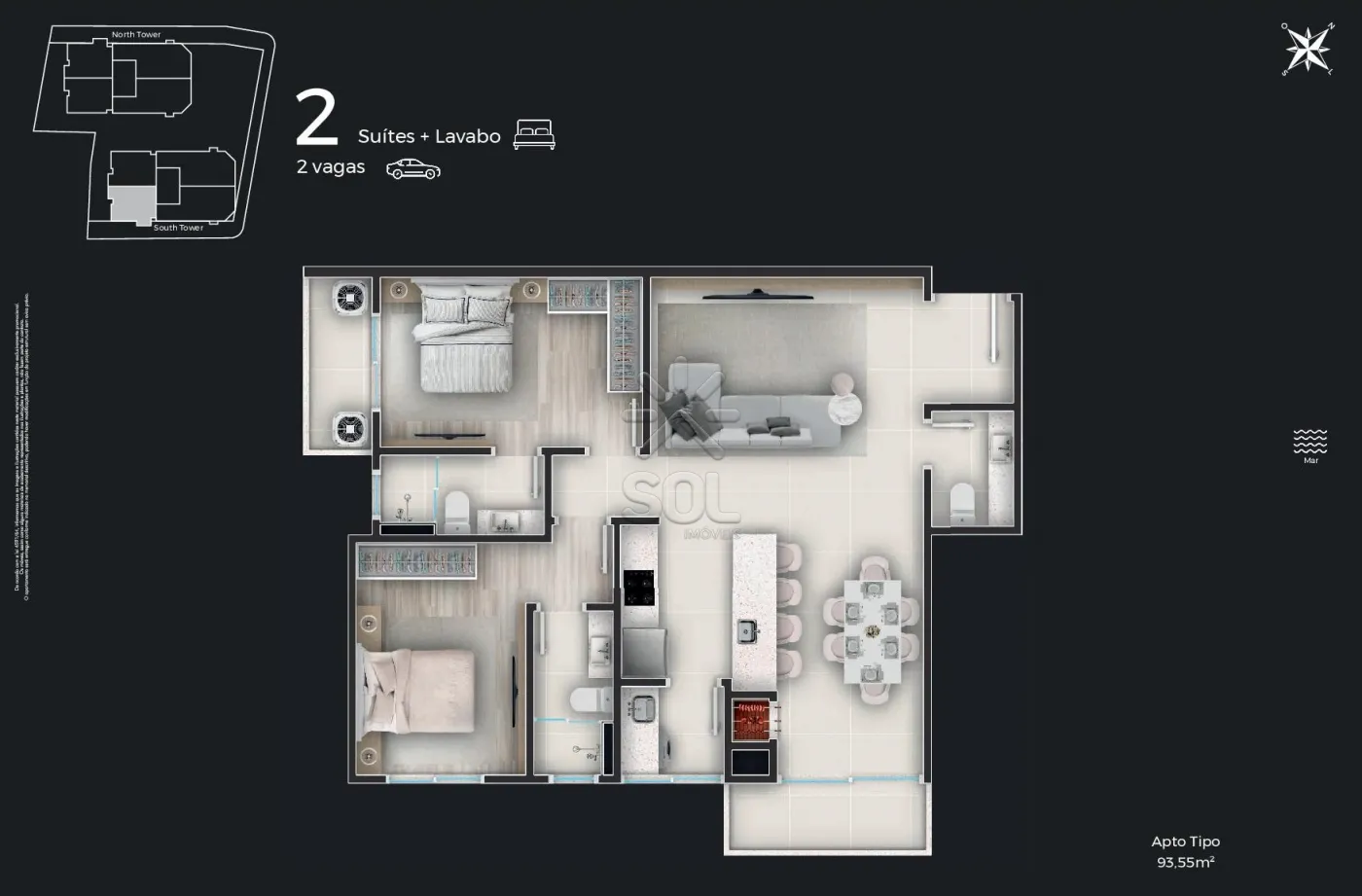 O empreendimento é composto por 2 torres imponentes, cada uma projetada para oferecer uma vista espetacular para o mar, maximizando a entrada de luz natural e proporcionando uma experiência de viver única.