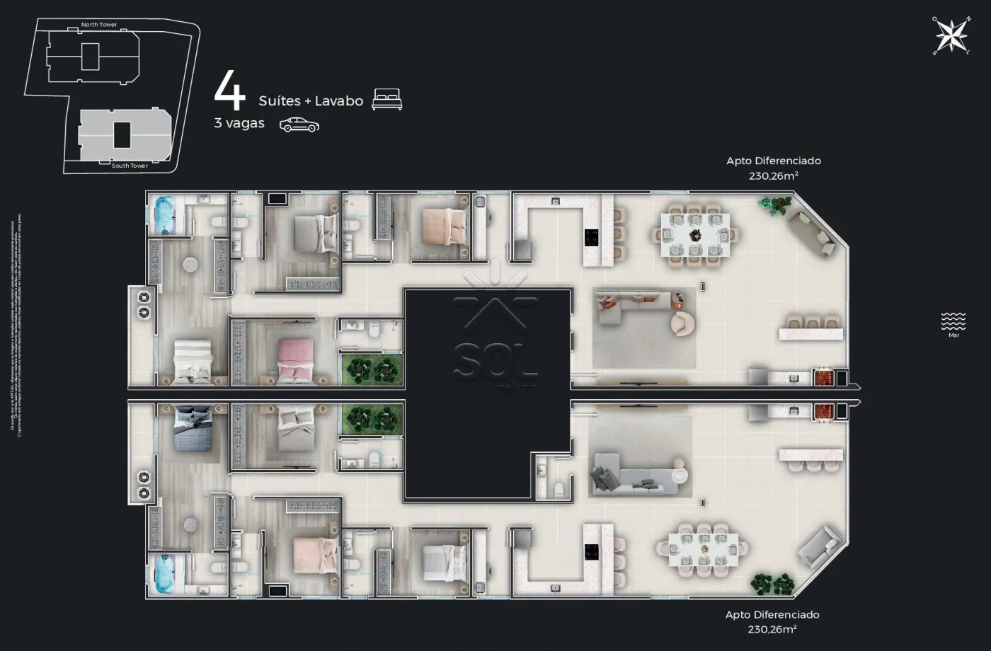 - Apartamentos diferenciados com área privativa de 230,26m², compostos por 4 suítes, living com ambientes integrados, área gourmet com churrasqueira, lavabo, área de serviço e 3 vagas de garagem;