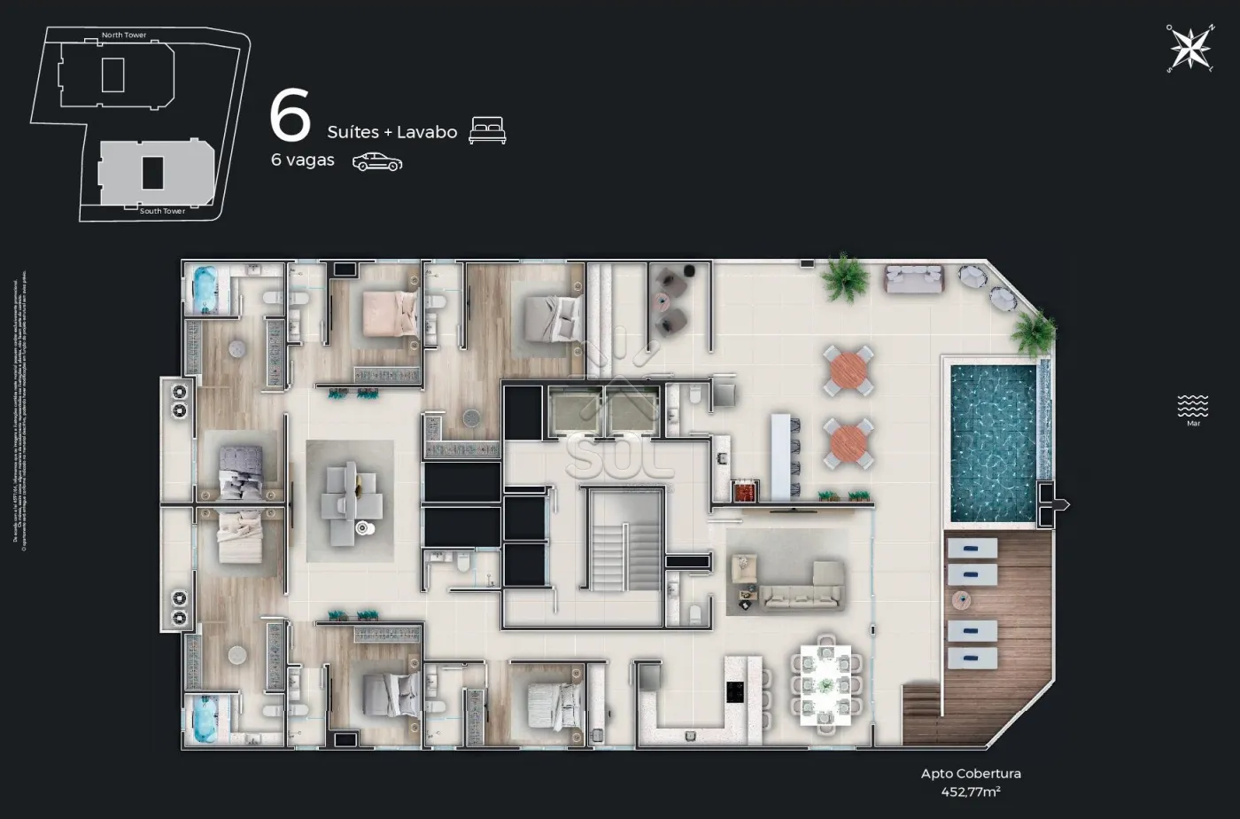 - Apartamento cobertura com área privativa de 452,77m², composto por 6 suítes, living com ambientes integrados, área gourmet com churrasqueira, piscina, lavabo, área de serviço e 6 vagas de garagem.