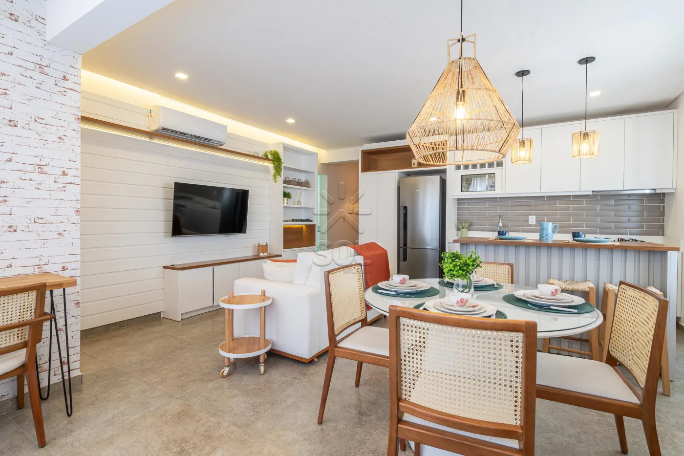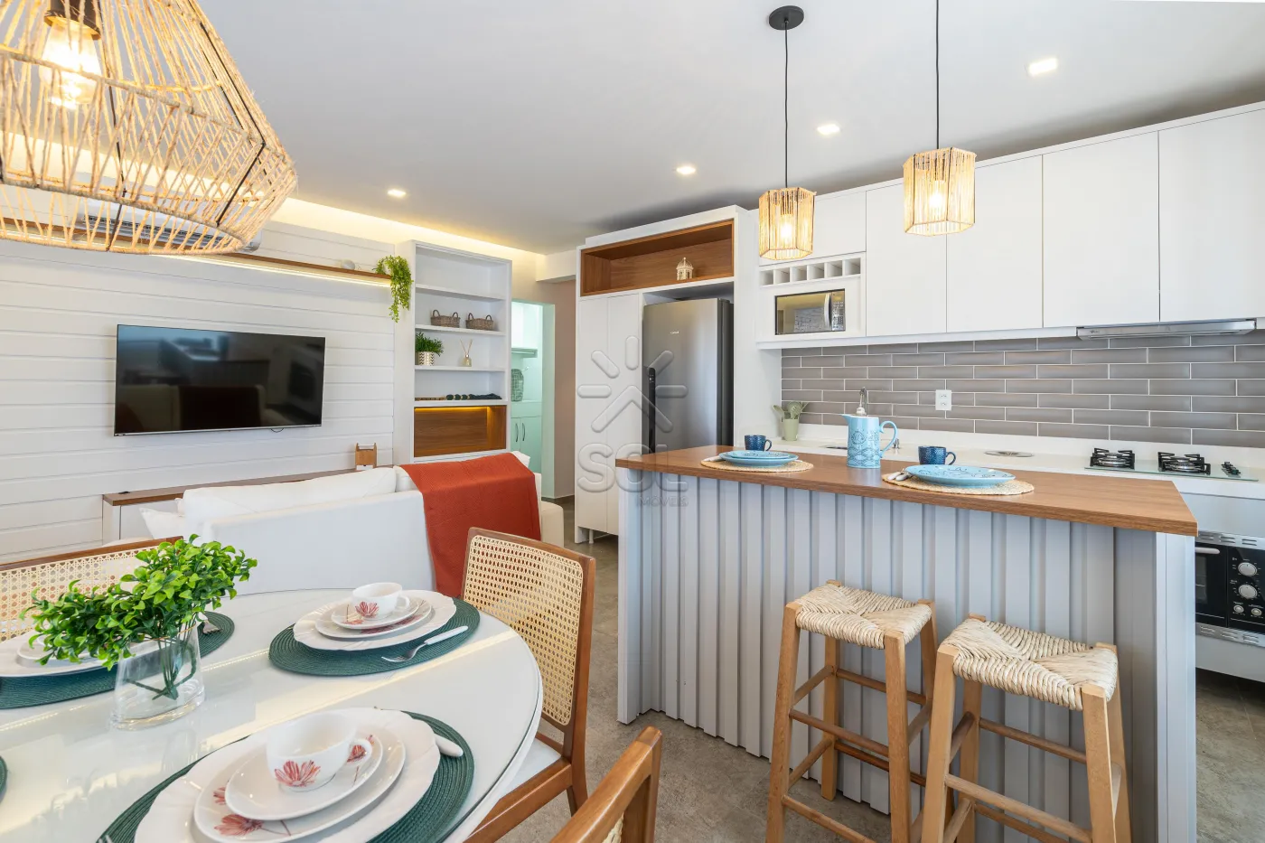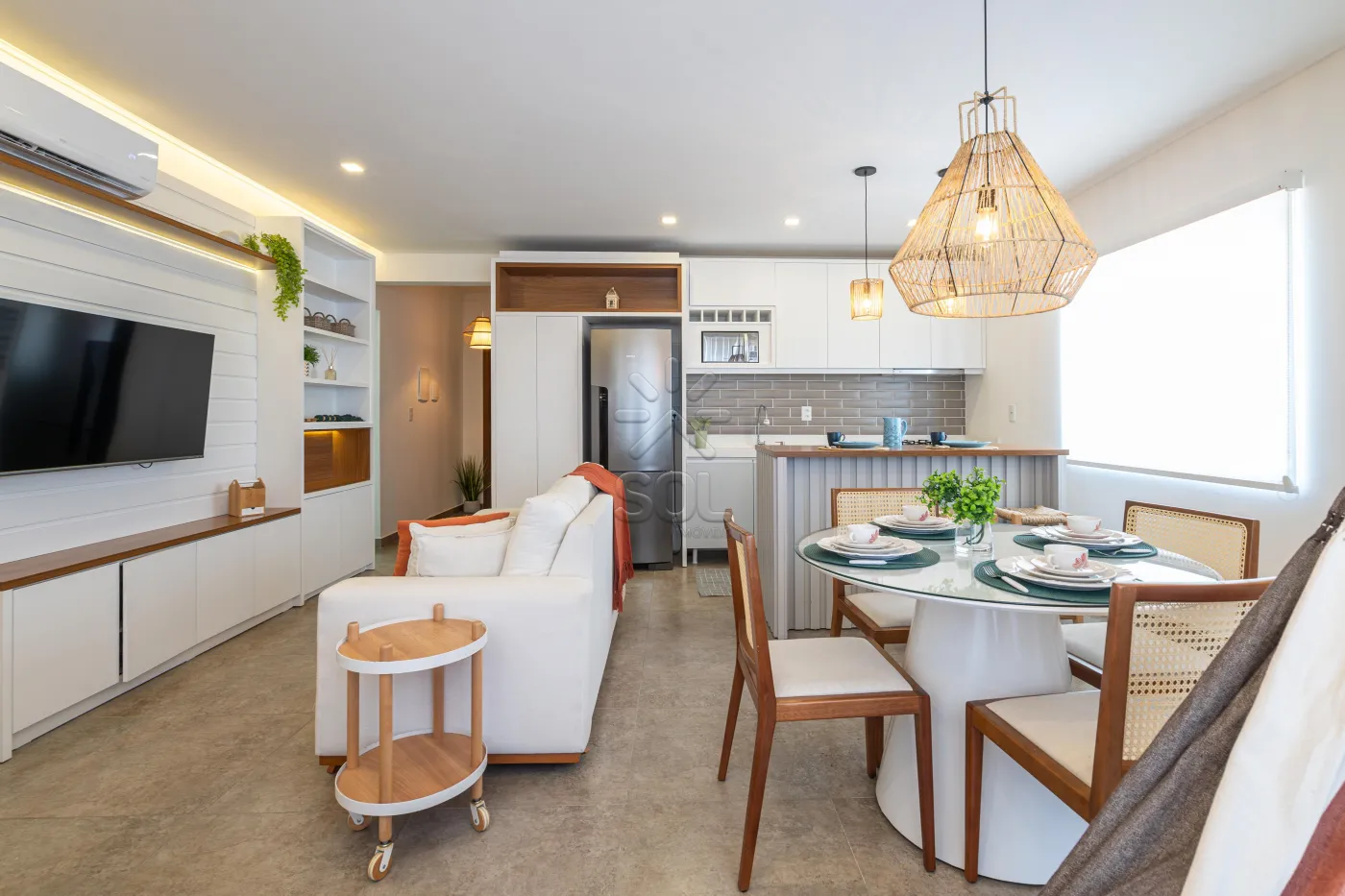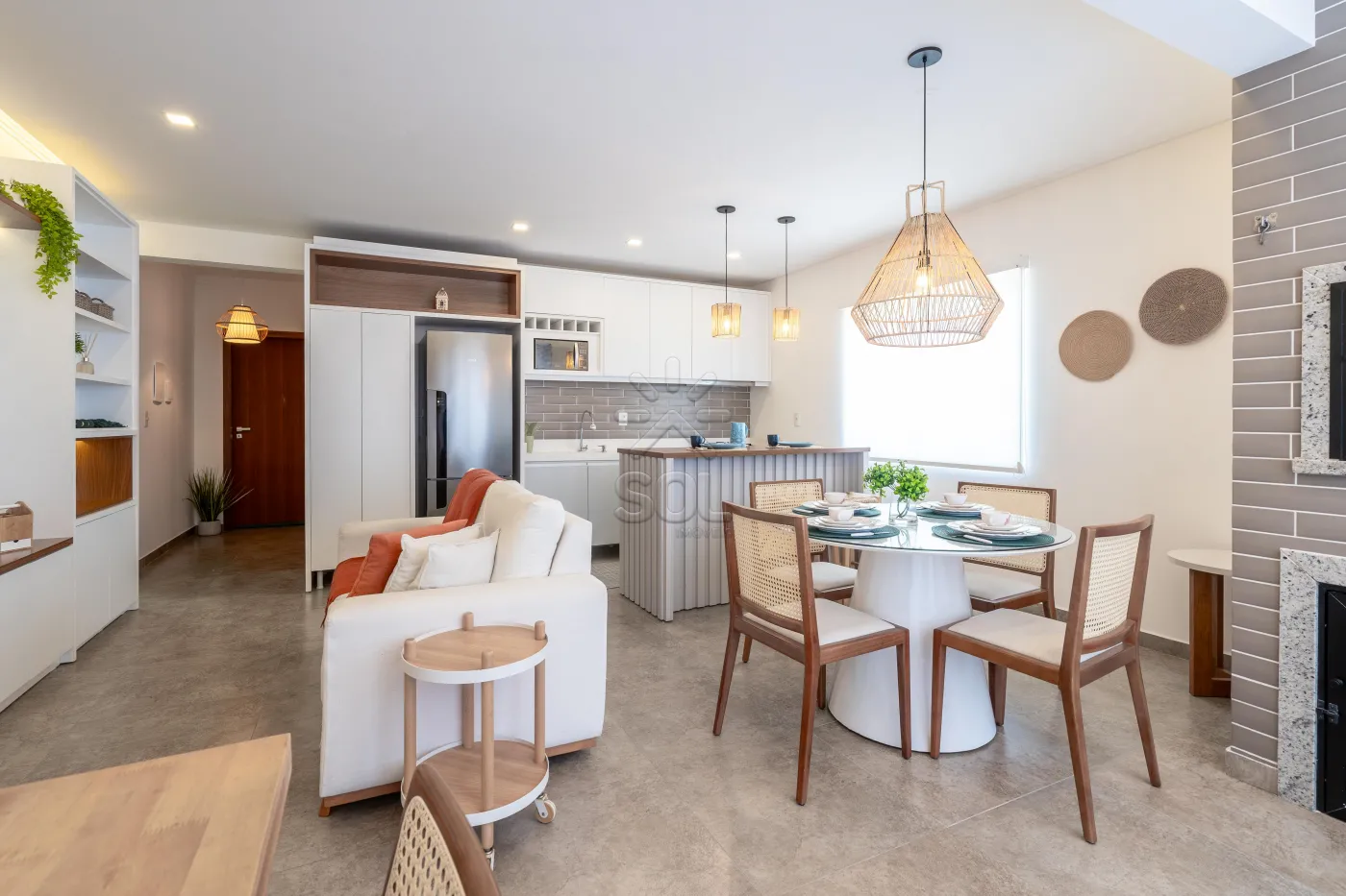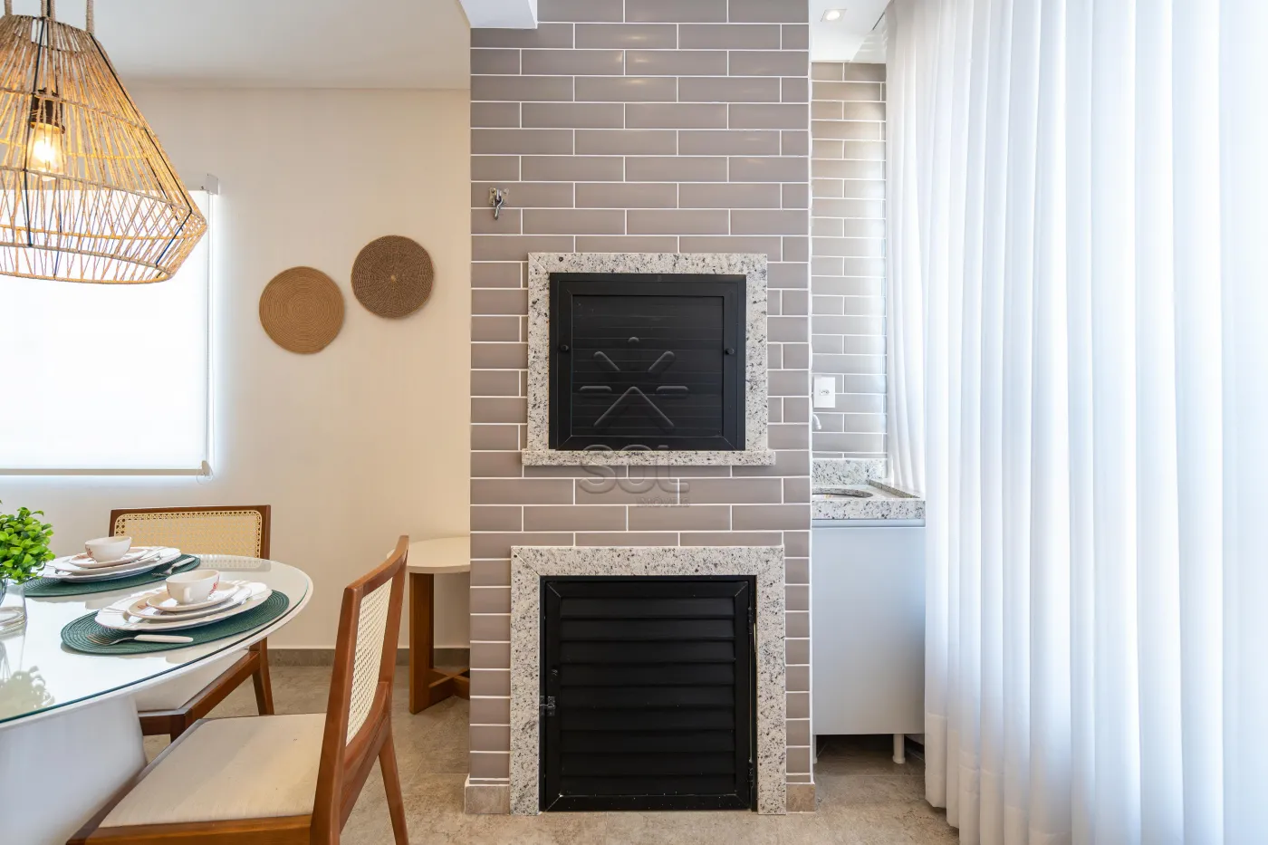 - Living integrado e acolhedor, com sala de estar, jantar, cozinha e churrasqueira;