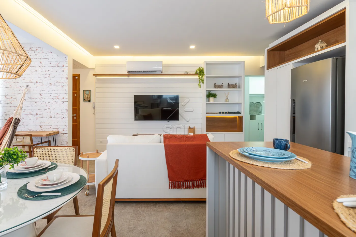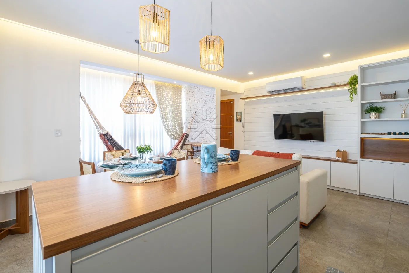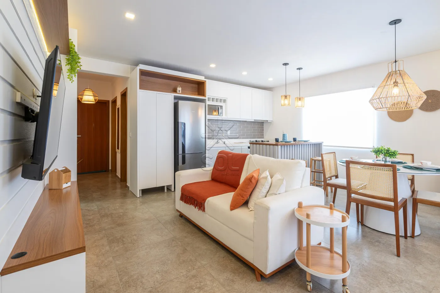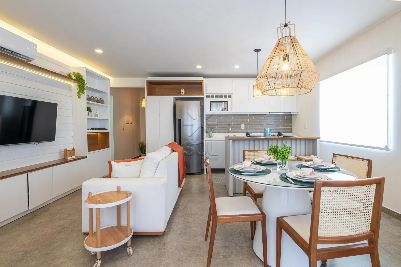 - Living integrado e acolhedor, com sala de estar, jantar, cozinha e churrasqueira;