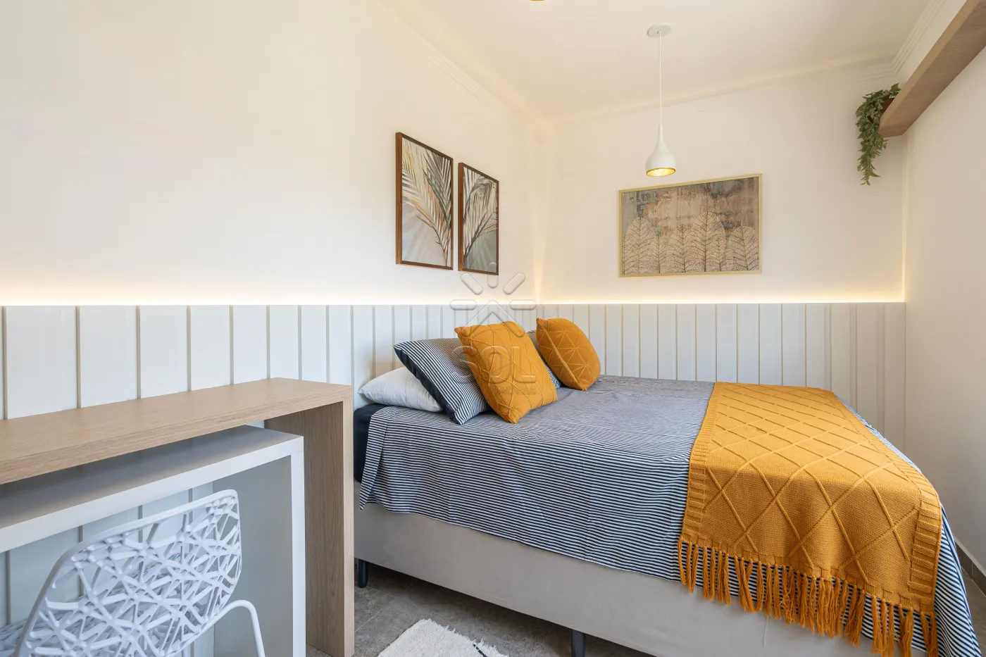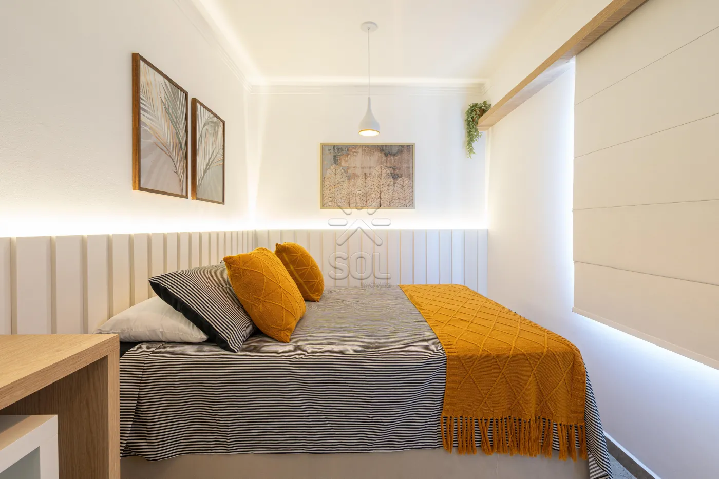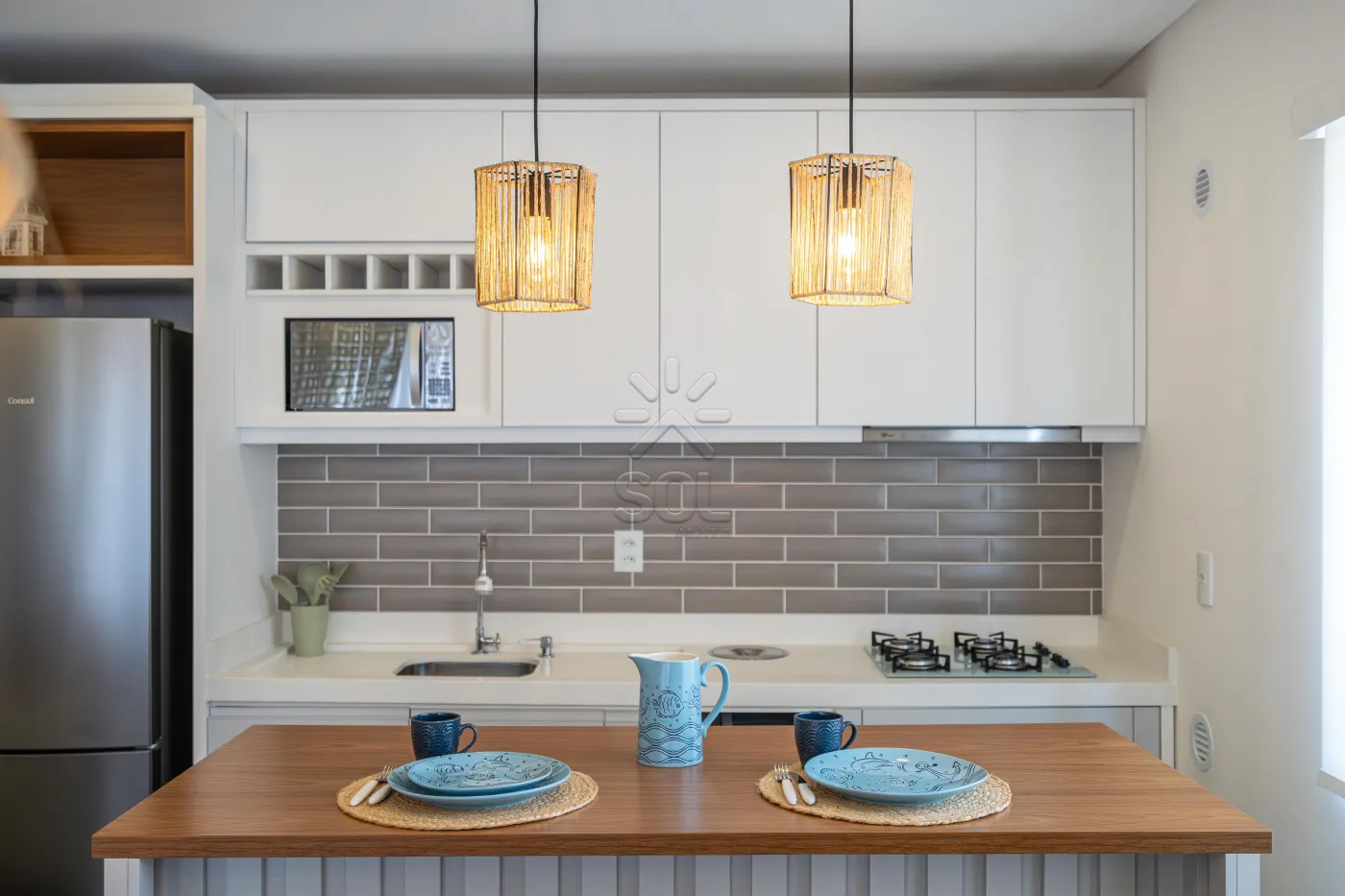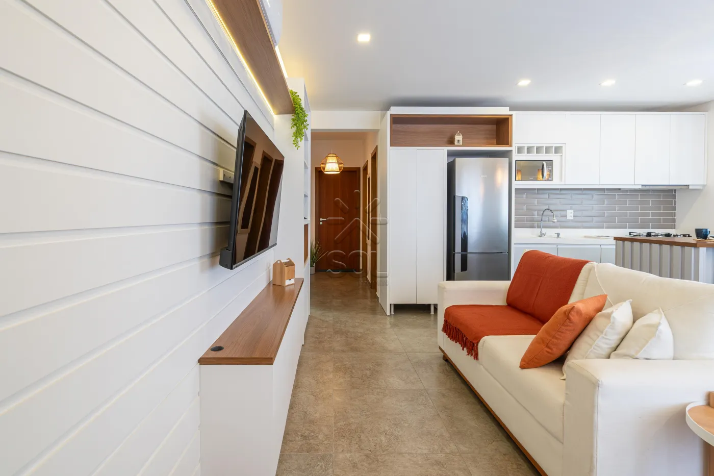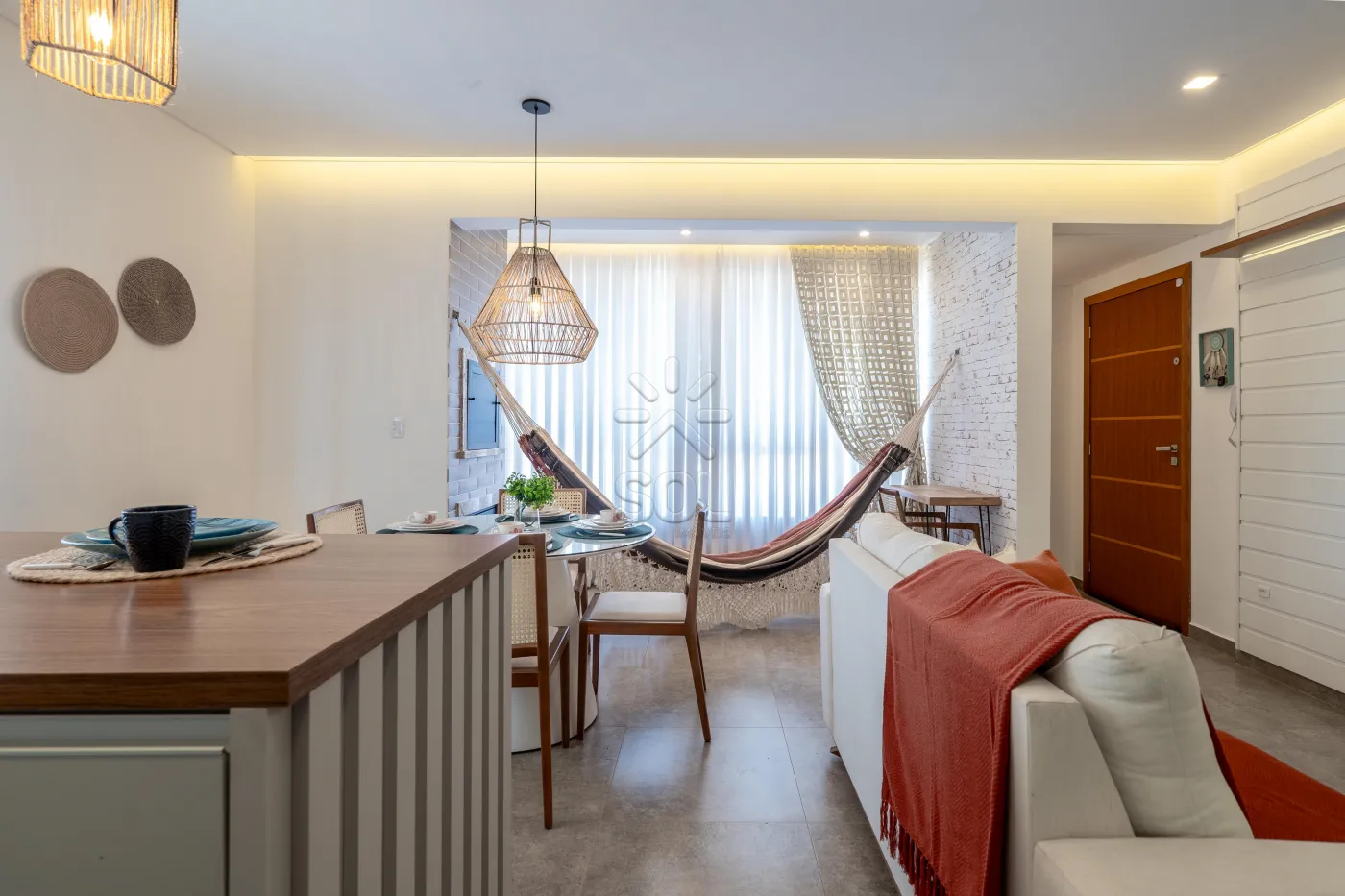 - Living integrado e acolhedor, com sala de estar, jantar, cozinha e churrasqueira;