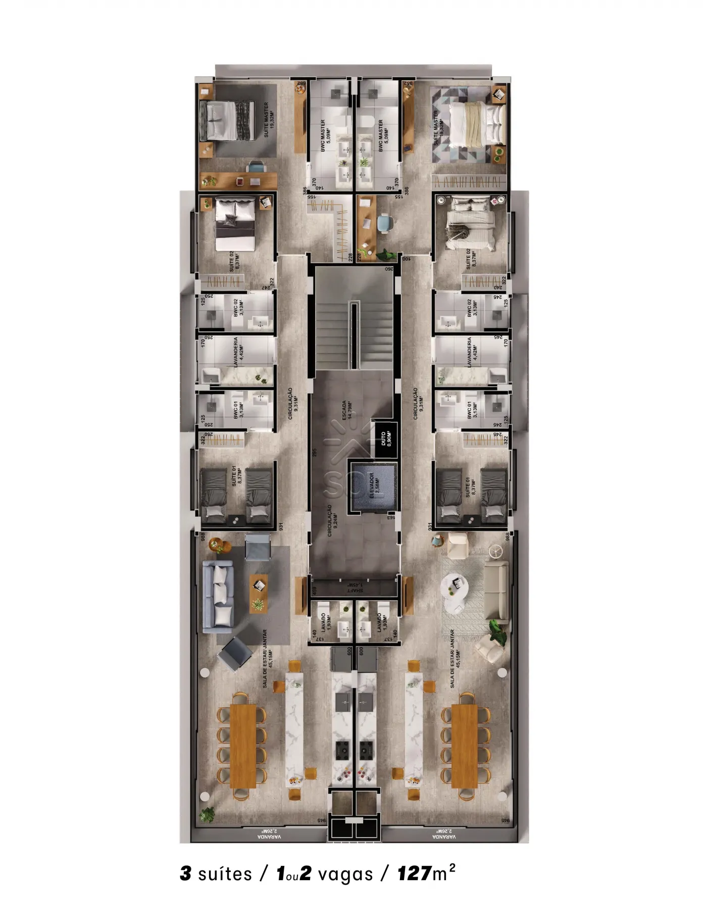 - 127,63m² de área privativa;