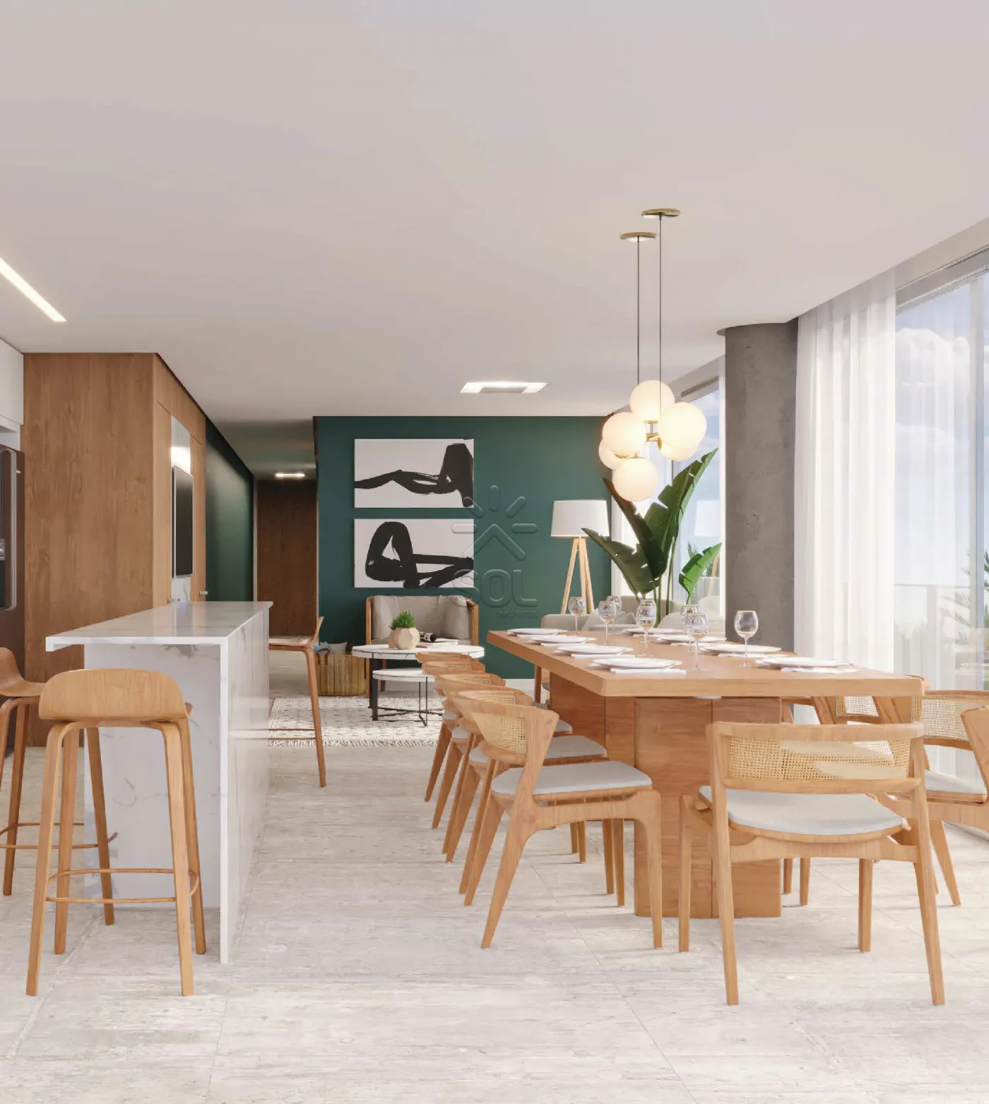 - Sala de estar e jantar integradas à cozinha com churrasqueira;