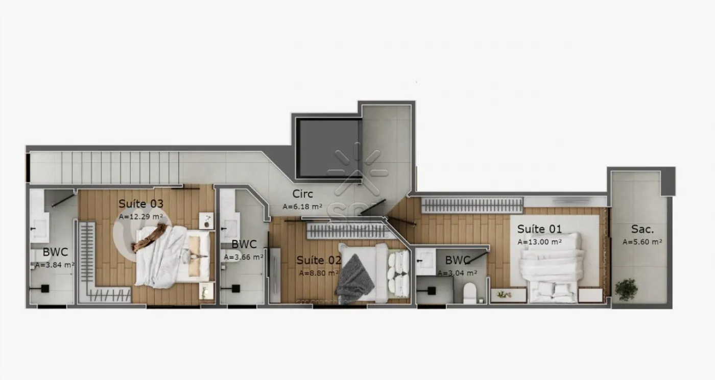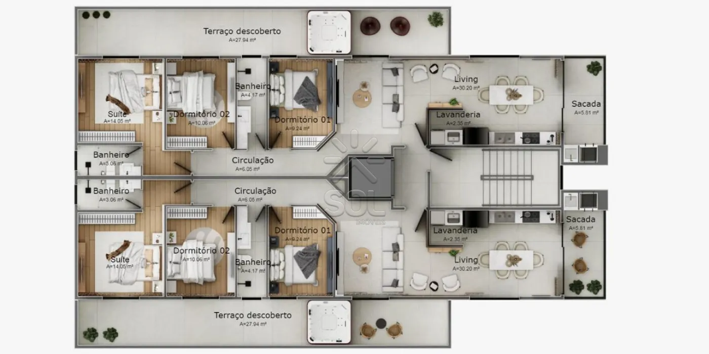 - Duplex de cobertura: 158,73m², com 3 suítes, living, sacada com churrasqueira, área gourmet, terraço e 2 vagas de garagem.