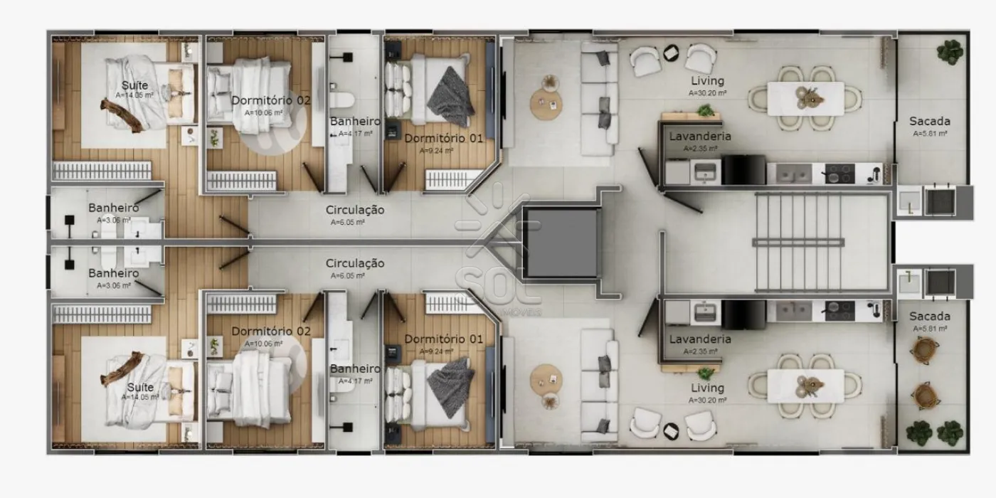 - Duplex de cobertura: 158,73m², com 3 suítes, living, sacada com churrasqueira, área gourmet, terraço e 2 vagas de garagem.