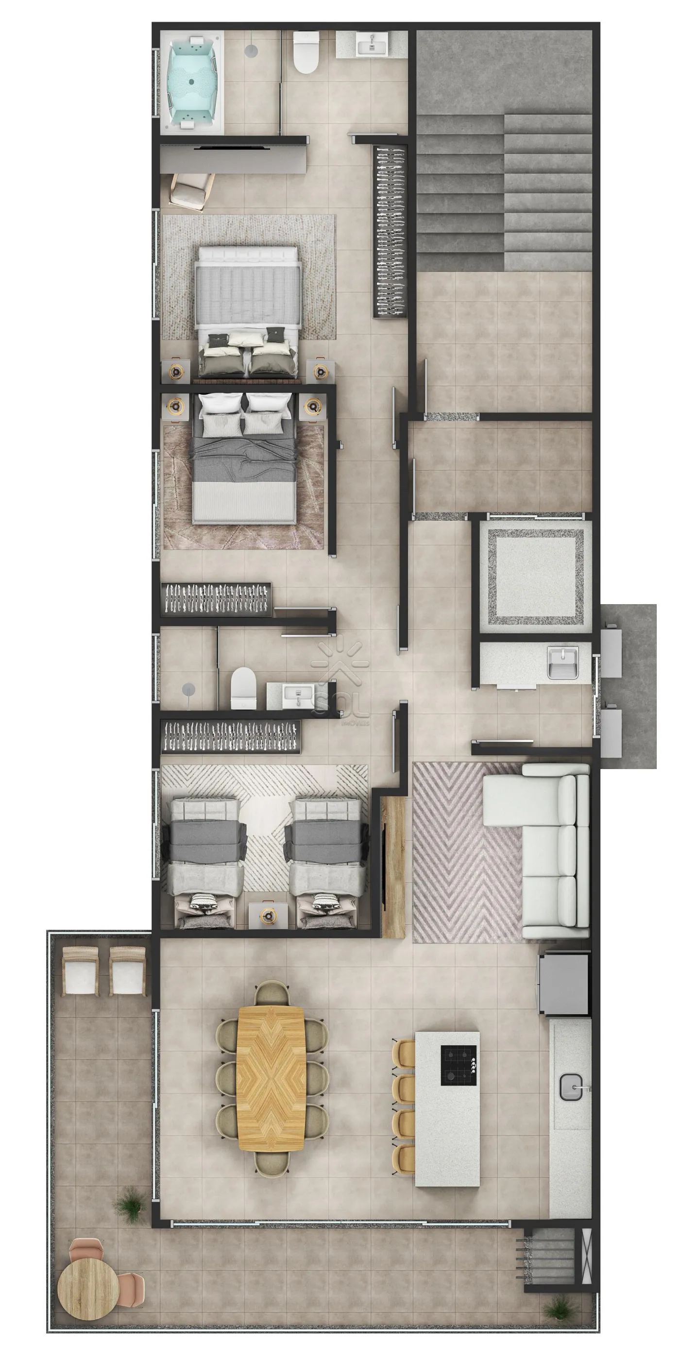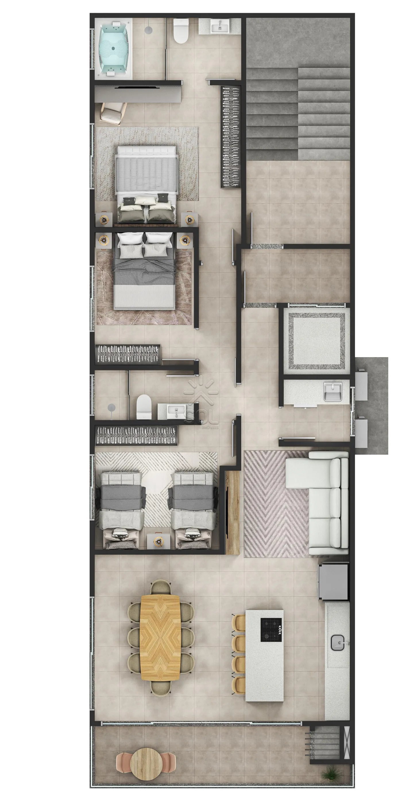 - Sala de estar e jantar integradas à cozinha;